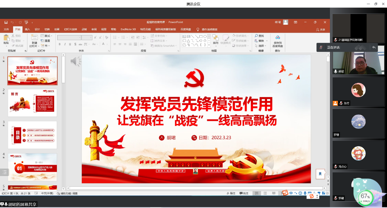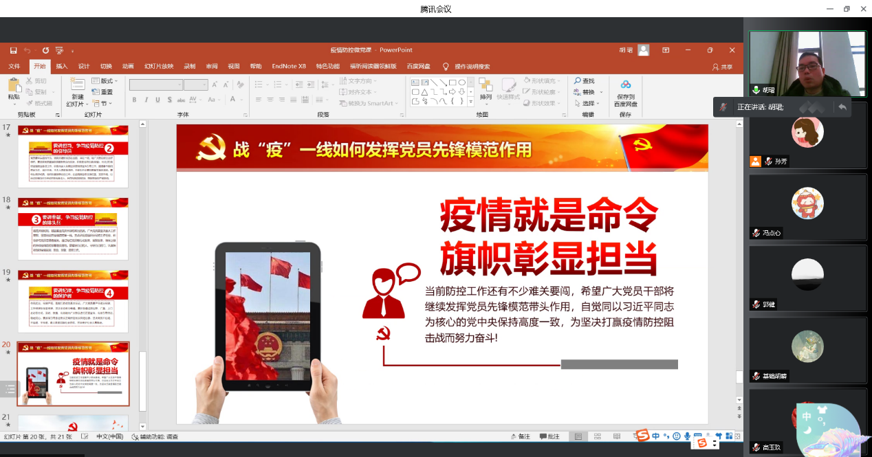 同时为响应上级组织和疫情防控工作要求,研究生党支部于3月23日下午开展线上微党课,支部书记胡珺同志向支部党员们讲授题为 “发挥党员先锋模范作用,让党旗在‘战疫’一线高高飘扬”疫情防控微党课。微党课主要包括三方面内容:第一,深刻领会什么是共产党人的先锋模范作用;第二,战“疫”一线对党员先锋模范作用的要求;第三,战“疫”一线如何发挥党员先锋模范作用。胡书记强调:面对疫情,党员应该争当疫情防控的急先锋、引导员、排头兵、保护者。最后,研究生党支部副书记孙芳同志再次强调疫情防范和宿舍安全等问题。