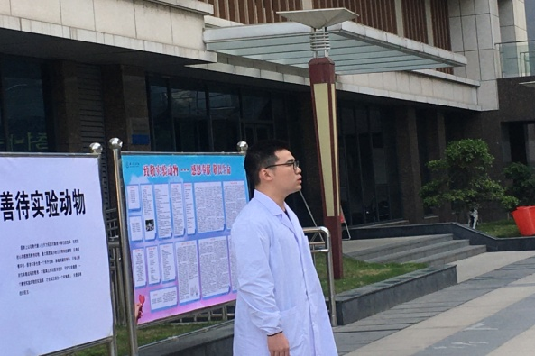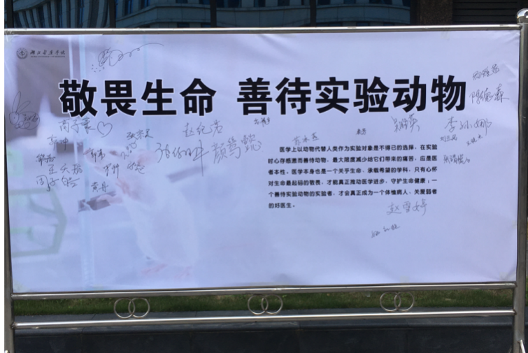活动最后,全体师生现场默哀一分钟,并依次在活动展板上签字承诺善待实验动物。