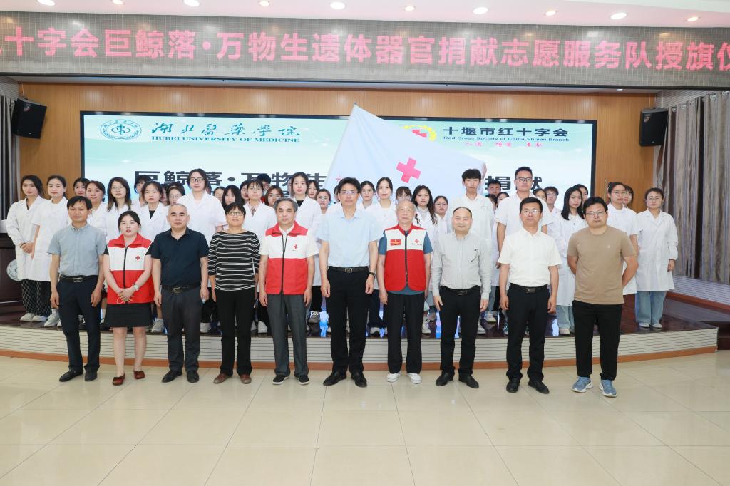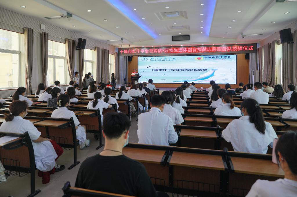 本网讯(通讯员 边晓璐)5月7日下午3点,为促进广大师生对遗体捐献有深入地了解,弘扬“人道、博爱、奉献”的红十字精神,十堰市红十字会巨鲸落·万物生遗体及器官捐献志愿服务队授旗仪式在湖北医药学院基础医学院六楼会议室举行。出席会议的嘉宾有十堰市红十字会常务副会长张志、十堰市红十字会庹丽,十堰市红十字志愿服务总队队长胡利民,湖北医药学院党委副书记、校长李和,党委学工部部长、校团委书记陈璞,基础医学院院长唐俊明,基础医学院分党委书记张秋芳,基础医学院副院长李健,基础医学院第六党支部书记姚柏春,遗体捐献接受站的相关老师,志愿服务队志愿者约150人参会。