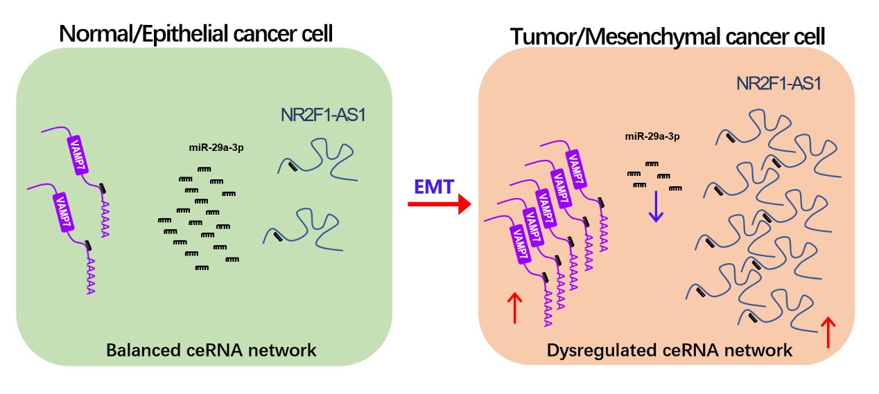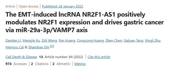 近日,该团队在胃癌中又鉴定到一个新的EMT-relatedlncRNA NR2F1-AS1,相关工作已在线发表于NPJ期刊Cell Death &Diseases (中科院一区Top期刊)。临床分析发现NR2F1与NR2F1-AS1高度共表达,并提示胃癌预后不良。机制分析发现NR2F1-AS1表达受EMT信号通路诱导,并通过miR-29a/VAMP7信号轴在胃癌中发挥促癌作用。该项工作为更好的理解肿瘤EMT发生以及开发靶向EMT的相关临床治疗手段提供了理论依据。以上系列研究课题得到国家自然科学基金和湖北医药学院博士启动金的资助。湖北医药学院李丹丹博士为第一作者,钦闪闪博士为论文通讯作者,徐梦婕、王梓迪、黄盼、黄聪聪等参与了部分工作,湖北医药学院为第一通讯单位。