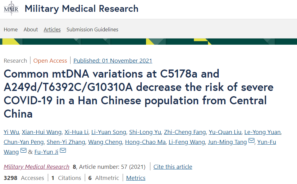 本网讯(通讯员 伍一 李锡花)湖北医药学院戢福云团队在《Military Medical Research》上,发表题为“CommonmtDNA variations at C5178a and A249d/T6392C/G10310A decrease the risk of severeCOVID‑19 in a Han Chinese population from Central China”的研究论文。该期刊2021年影响因子为34.915。湖北医药学院戢福云教授、王云甫教授、唐俊明教授为论文的共同通讯作者,湖北医药学院2018级研究生伍一、湖北医药学院王贤慧实验师、李锡花博士为共同第一作者。