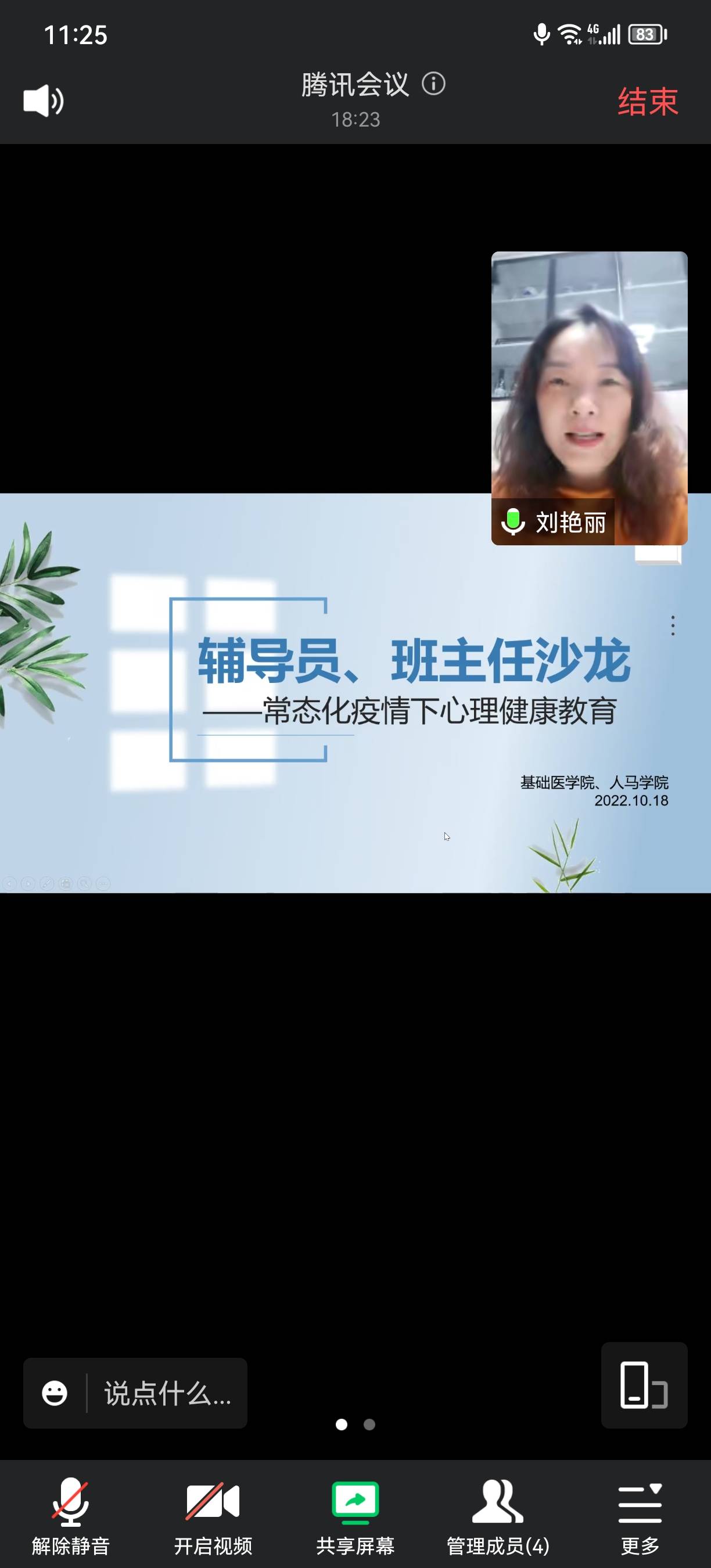 刘艳丽结合平时丰富学生工作经验,分析了当前疫情下我校大学生的心理新特点及心理健康教育开展情况,并根据秋季心理普查结果对大学生心理危机预防工作形势进行研判。李健表示,健康的心理是有效进行思想教育和文化学习的重要前提,辅导员老师作为学生成长路上的重要引导者,要在学习上生活中关注学生心理状态变化。与会辅导员结合自己的工作经历,围绕日常工作各抒己见,交流观点与看法、困难与经验,实现了思想上的碰撞,共同探讨了辅导员如何开展疫情期间学生心理健康教育。