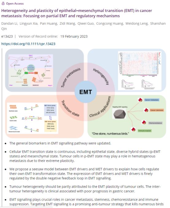 湖北医药学院基础医学院钦闪闪团队长期致力于胃癌发生及转移领域的研究,先后发现IRF6(Front Oncol,2019)、MAGI2-AS3(MTNA,2020)、UBE2CP3(Oncogene,2021)、NR2F1-AS1(CDDisease,2022)、PRSS23(Front Immunol,2022)、ELF3-AS1(JECCR,2022)、IGFBP7(CDDiscovery,2023)等多个EMT相关的基因与胃癌预后不良密切相关,提示EMT信号通路在驱动胃癌恶性进展中扮演着重要角色。为了进一步系统性了解EMT领域最新研究进展,该团队近日组织了题为Heterogeneity and plasticity of epithelial–mesenchymal transition (EMT) in cancer metastasis: Focusing on partial EMT and regulatory mechanisms的综述论文,发表在中科院一区期刊Cell Proliferation (IF=8.755)。
