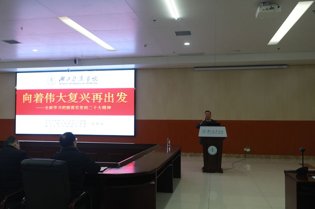 首先由基础医学院分党委书记张秋芳带领与会师生党员重温入党誓词。学校党的二十大精神理论宣讲专家、研究生院分党委书记孔祥清以《向着伟大复兴再出发——全面学习把握落实党的二十大精神》为题做辅导报告,他从实践基础、机遇挑战、理论指导、中心任务、战略支撑、根本保障、青年责任等七个方面解读党的二十大报告精神,重点围绕党的二十大报告关于教育、科技、人才工作的战略部署进行讲述,系统阐述了教育、科技、人才工作的辩证关系、取得的历史成就、新时代新征程的战略部署,号召师生党员坚定拥护“两个确立”,做到“两个维护”,不忘报国初心使命,勇担青年时代责任,凝聚团结奋斗力量,奋力建设教育强国、科技强国、人才强国,以中国式现代化全面推进中华民族伟大复兴。