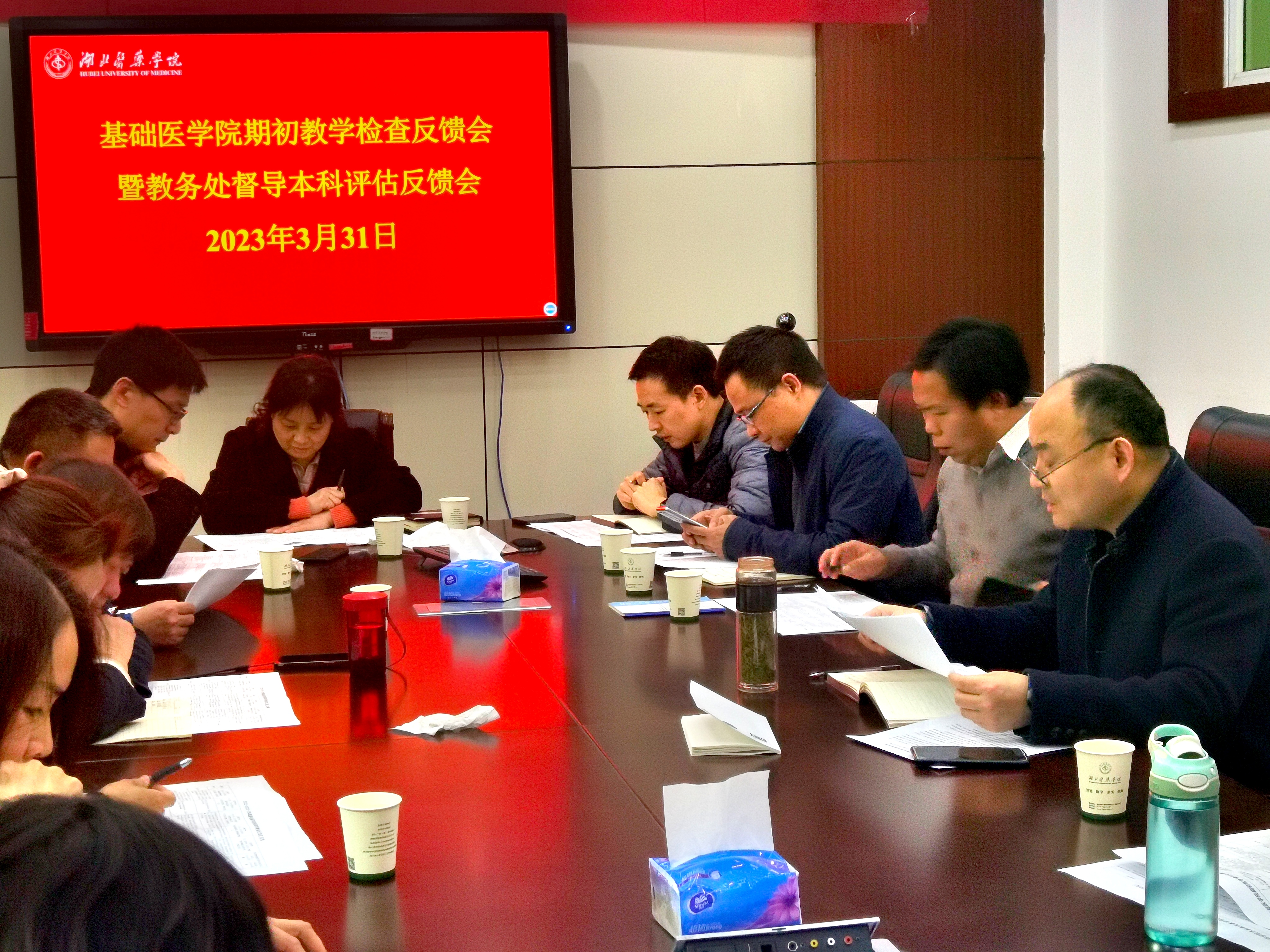 3月31日下午,基础医学院召开期初教学检查反馈会暨教务处督导本科教学审核评估反馈会,学院领导、各教研室主任及各办公室人员参加会议,会议反馈了期初教学检查发现的问题及整改意见,并安排下一阶段工作,唐俊明要求:一是各教研室要进一步领会本科教育教学审核评估指标体系的重要内涵,准确把握各学科特点,凝练总结关键点,真抓实干;二是各教研室要按照反馈情况再次进行整改完善,学院将于4月中旬开展整改落实检查工作,并再次进行会议反馈。