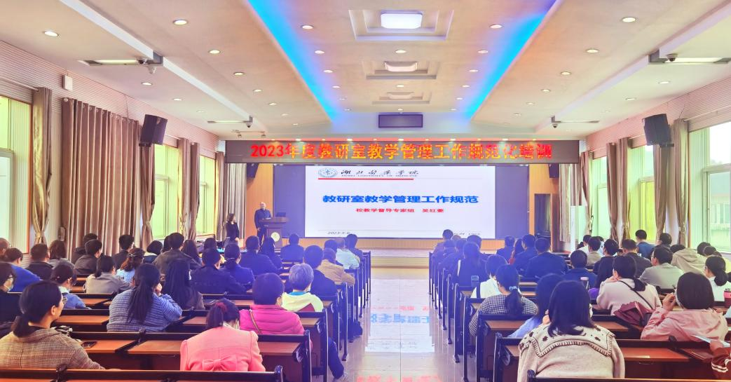 本网讯(通讯员 丁演鹂)为进一步提升我院教育教学水平,规范教研室教学管理工作,5月6日下午学院在基础医学院六楼功能报告厅开展教研室教学管理工作规范化培训,全院无课教师均参加。本次培训,特邀校教学督导专家吴红菱教授主讲,基础医学院院长唐俊明主持会议。