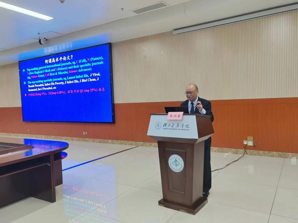 随后,朱兴权以“申报国家自然科学基金项目的体会”为题开展第二讲。他以曾益新、高福两位院士,及“双非”高校“国家杰青”为例,鼓励广大青年教师要树立信心,不要妄自菲薄,再结合自身申报国家自然科学基金的经验,讲述了国家自然科学基金各类项目申报的要求、撰写注意事项,并从选题、“立题依据”及“创新性”、研究内容及方法、科学问题凝练、“题目”和“摘要”拟定、年度计划制定、学风、文笔等方面进行了讲解。