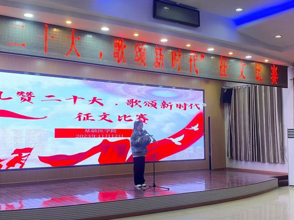 本网讯(通讯员 陈健萱 饶悦)为弘扬党的二十大精神,引领同学们思考新时代青年的责任和义务,基础医学院分团委、学生会于11月12日在1号楼六楼多功能厅开展“礼赞二十大,歌颂新时代”征文比赛决赛。基础医学院分团委副书记饶悦以及学院全体学生参加活动。