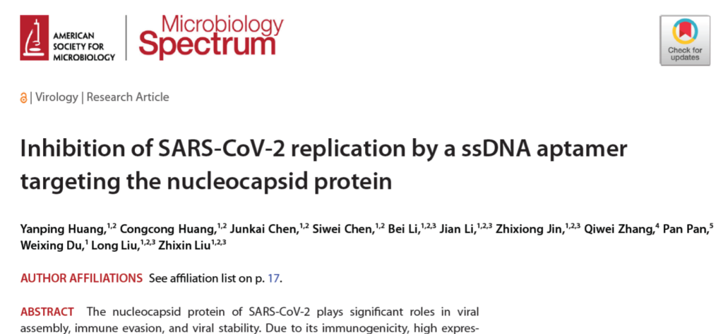 近日,病毒学十堰市重点实验室(湖北医药学院病毒学研究所)刘志新研究团队在美国微生物学会(American Society for Microbiology, ASM)旗下期刊Microbiology Spectrum在线发表题为“Inhibition of SARS-CoV-2 replication by a ssDNA aptamer targeting the nucleocapsid protein” 的研究成果。该研究发现,通过核酸适配体靶向抑制新冠病毒N蛋白可以有效抑制病毒复制。
