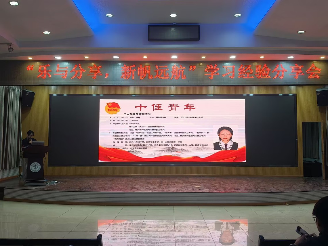 本网讯(通讯员 陈海博 饶悦)10月24日晚,基础医学院在一号楼六楼报告厅开展“乐与共享,新帆远航”学习经验分享活动。本次活动邀请了2024年国家奖学金、“十佳青年”获得者龚铭同学进行分享,辅导员饶悦和2025级全体新生参加。