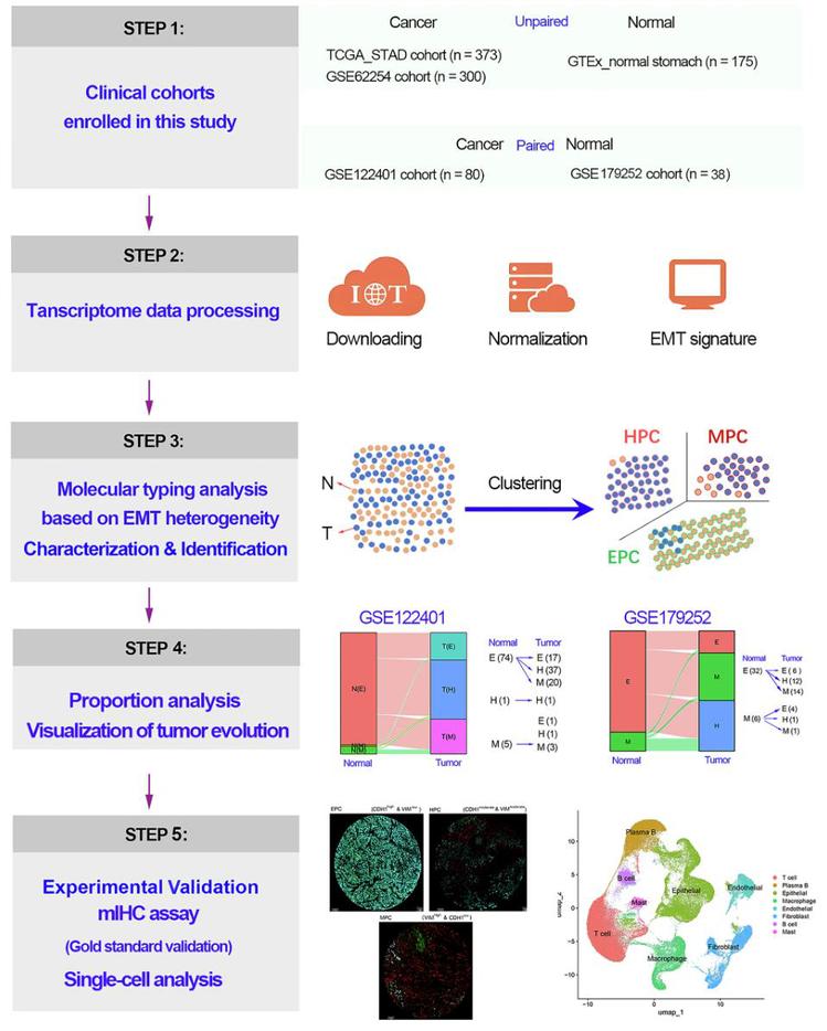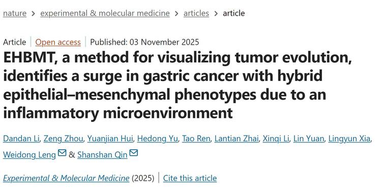 近日,湖北医药学院钦闪闪研究团队在中科院1区Top期刊Experimental & Molecular Medicine (IF5=14.2)发表了题为“EHBMT, a method for visualizing tumor evolution, identifies a surge in gastric cancer with hybrid epithelial–mesenchymal phenotypes due to an inflammatory microenvironment”研究论文(Method Article),正式推出一种原创性的肿瘤进化可视化方法——EHBMT(A EMT Heterogeneity-Based Molecular Typing method),为上述难题提供了高效、经济且普适的新解决方案。