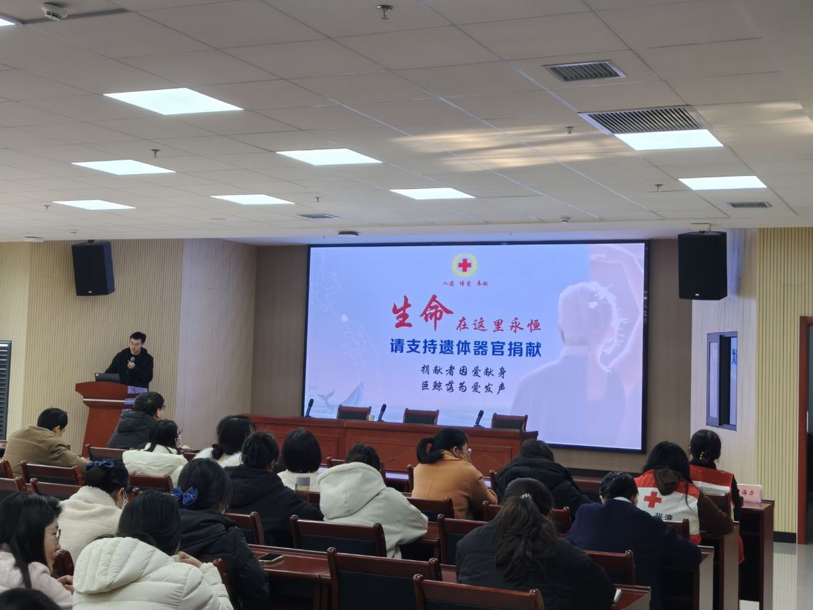 本网讯(通讯员张伟)为进一步普及人体器官捐献知识,弘扬“人道、博爱、奉献” 的人道主义精神,提升职工及群众对人体器官捐献的认知与认同,2025年12月11日下午2时30分,湖北医药学院基础医学院巨鲸落· 万物生遗体及器官捐献志愿服务队在张湾区人民医院学术报告厅开展人体器官捐献知识专题讲座,这是该队伍本年度第五次到十堰市周边各县区举行遗体器官捐献知识讲座。医院领导班子成员、各科室医护人员代表、部分患者及家属代表参加讲座,讲座由张湾区红十字会党组成员、专职副监事长王海力主持。