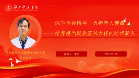 活动中,李勇老师紧紧围绕党的二十届四中全会及湖北省委十二届十一次全会精神,系统阐释了“以中国式现代化全面推进强国建设、民族复兴伟业”的总体目标和湖北省“加快建成中部地区崛起重要战略支点”的部署要求。他强调,要深刻把握“为党育人、为国育才”的初心使命,将“教育家工匠精神”贯穿医学教育教学全过程,深耕主责主业,锤炼专业本领,常怀感恩之心,善待身边同志,恪守职业操守与医学伦理,引导学生树立正确的人生观、价值观,切实增强服务“健康中国”战略的使命意识和责任担当。